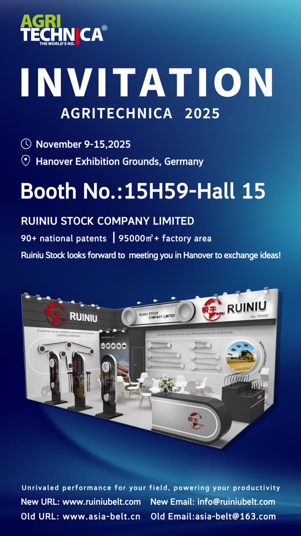 AGRITECHNICA è la fiera leader mondiale per macchinari e tecnologie agricole, punto di incontro globale per leader del settore, innovatori e professionisti. Ruiniu è orgogliosa di partecipare all'evento e presenterà le sue tecnologie avanzate e i suoi prodotti innovativi.